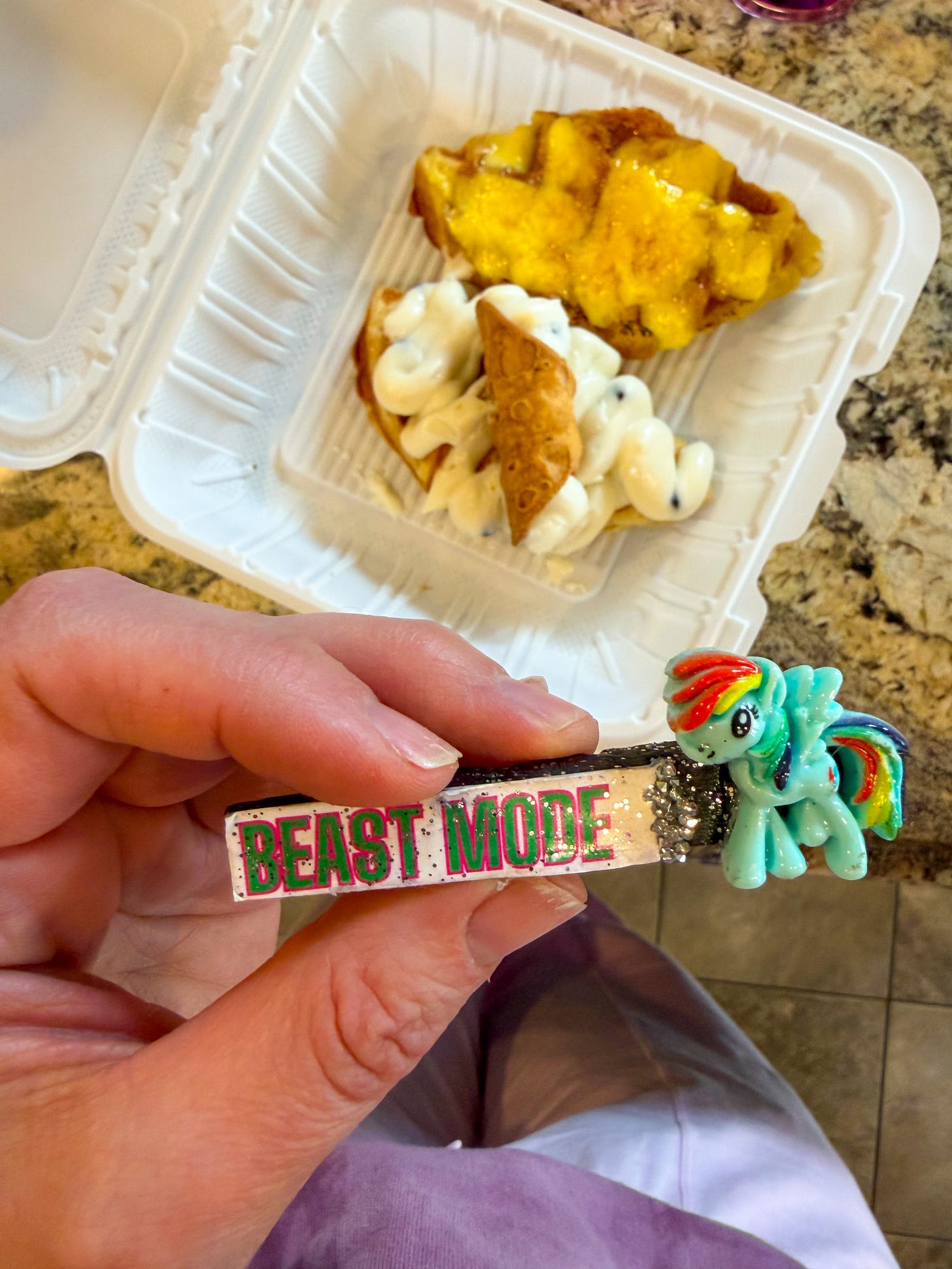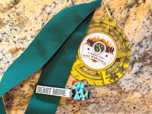 When we arrived, I stepped out of the car and noticed a broken clothespin on the ground. I laughed and left it. When we returned post‑race, someone had placed it neatly on my door handle — as if I’d forgotten it. It felt like a tiny, odd little sign, so yes, the “Beast Mode” My Little Pony mashup came home with me.