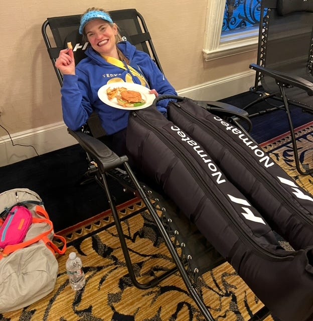 Mile 20: I don’t think I can ever run a race without pickle juice again (this one from Pickle Juice is my fave). It was such a game changer. Helpful with refueling so late in the race — the right zing of salty brine. I’d heard much about the cramping people often experience on the course, but I credit Pickle Juice and downhill runs on my SOLE TT8 Treadmill for keeping that all at bay.